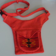 Moderna etno torbica koja se može nositi oko pasa ili preko ramena. Torbica je uniseks, a na poleđini ima također džep koji ima patentni zatvarač. Prednja strana tj. džep torbe je od ručnog tkanja, šiveni materijal je od mekane, podatne alkantare.