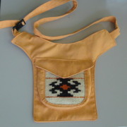 Moderna etno torbica koja se može nositi oko pasa ili preko ramena. Torbica je uniseks, a na poleđini ima također džep koji ima patentni zatvarač. Prednja strana tj. džep torbe je od ručnog tkanja, šiveni materijal je od mekane, podatne alkantare.
